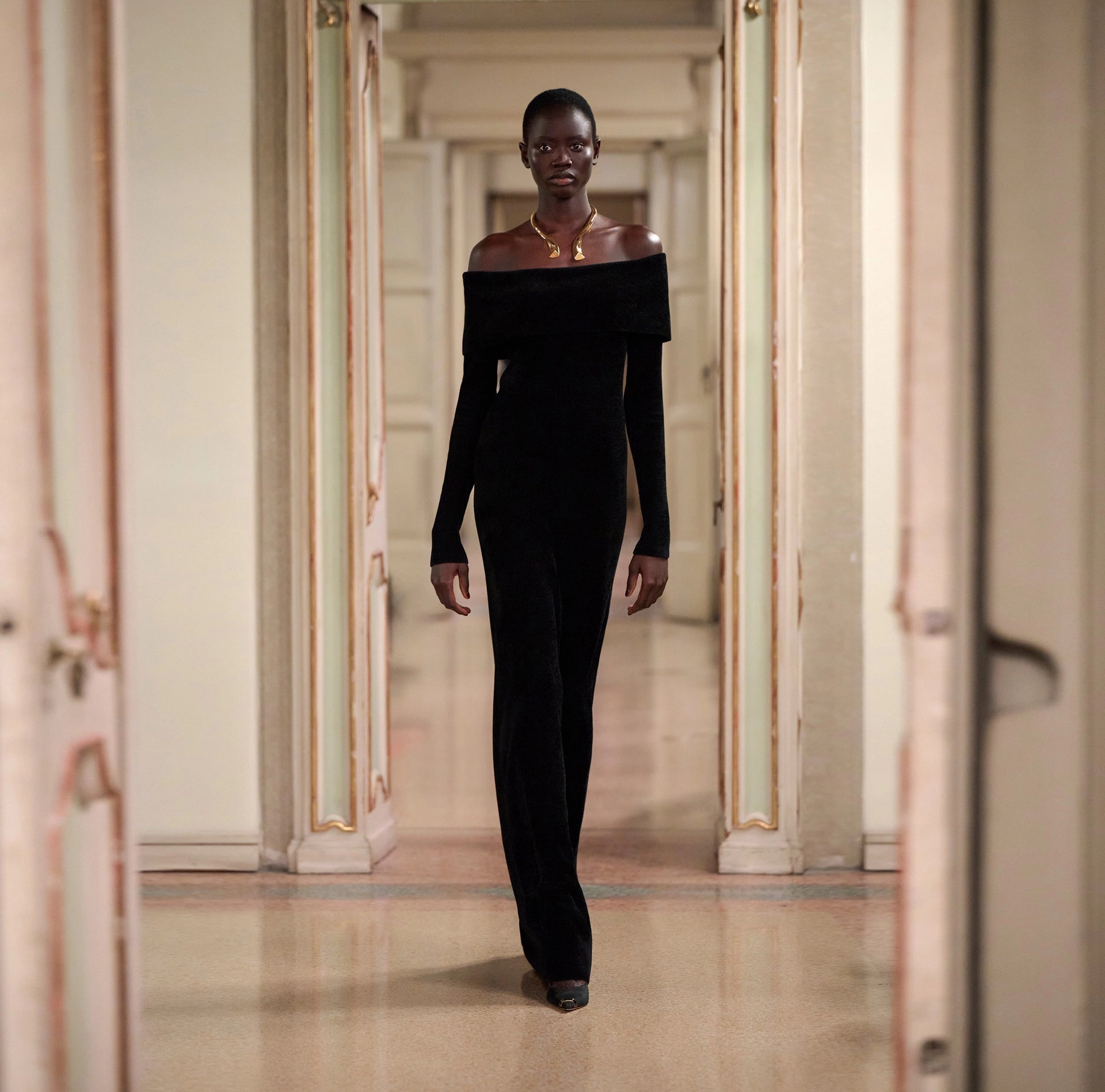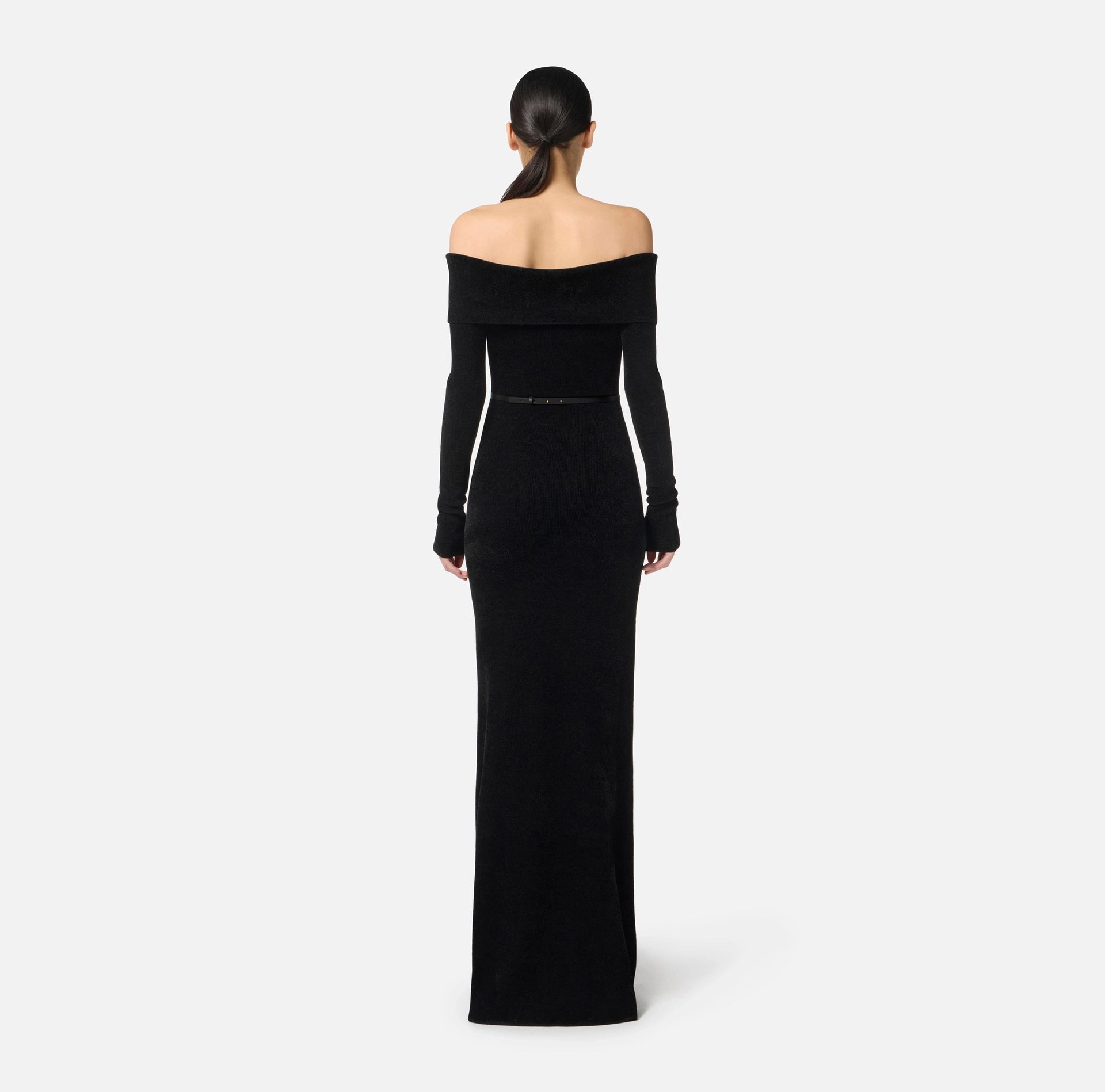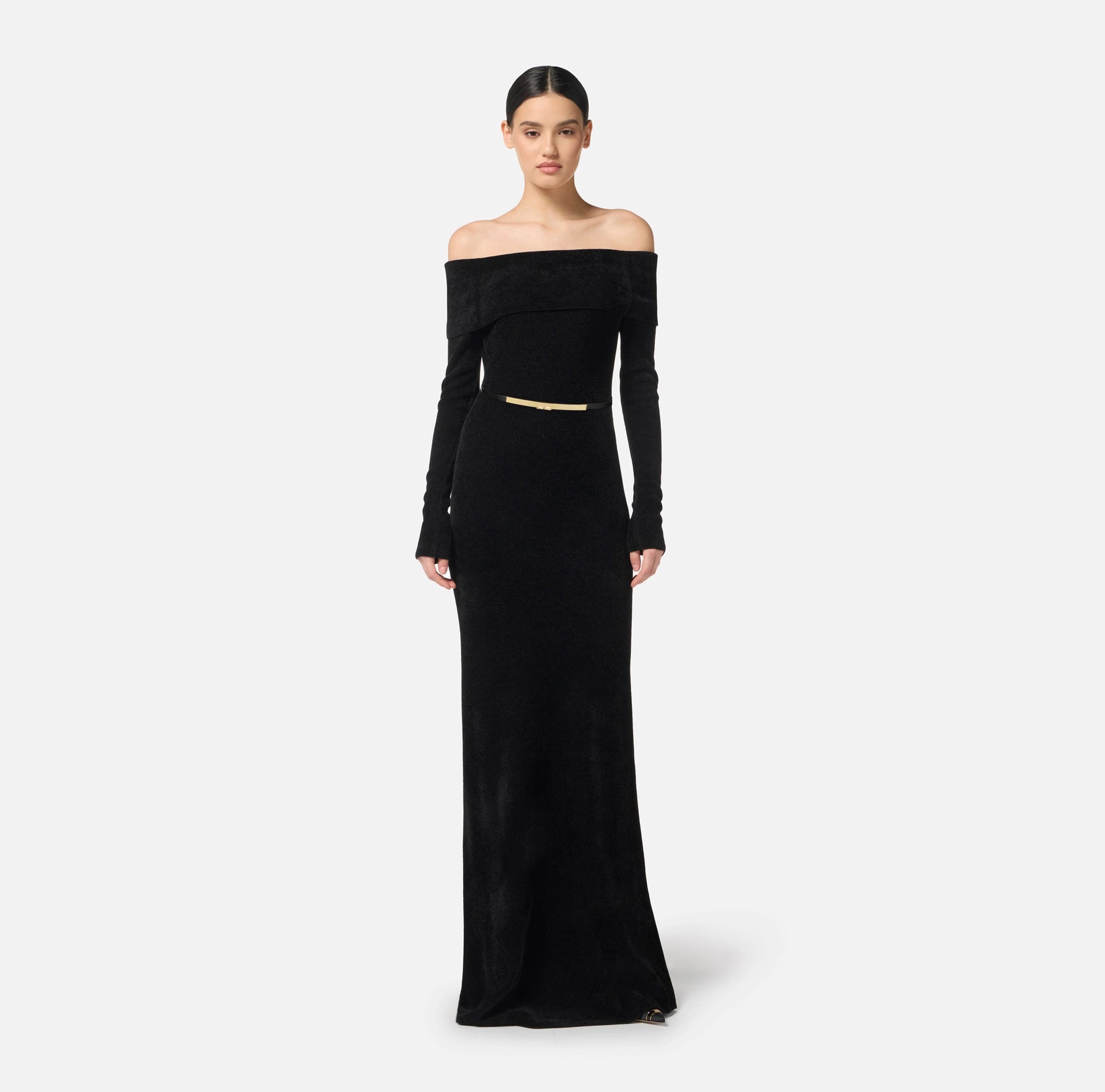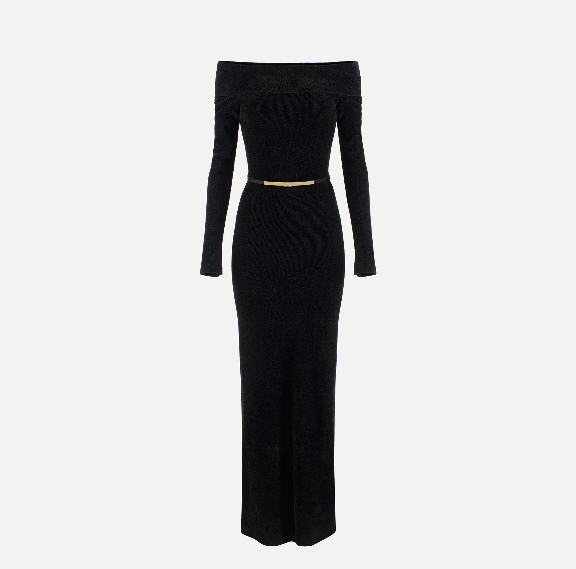 Abito da sera in ciniglia dalla vestibilità aderente. Il vestito ha maniche lunghe e si distingue per l'ampio scollo a barca, ripiegato per avvolgere le spalle e regalare una silhouette armoniosa. La cintura tubolare ha dettaglio in metallo dorato ed è amovibile, per più opzioni di styling.