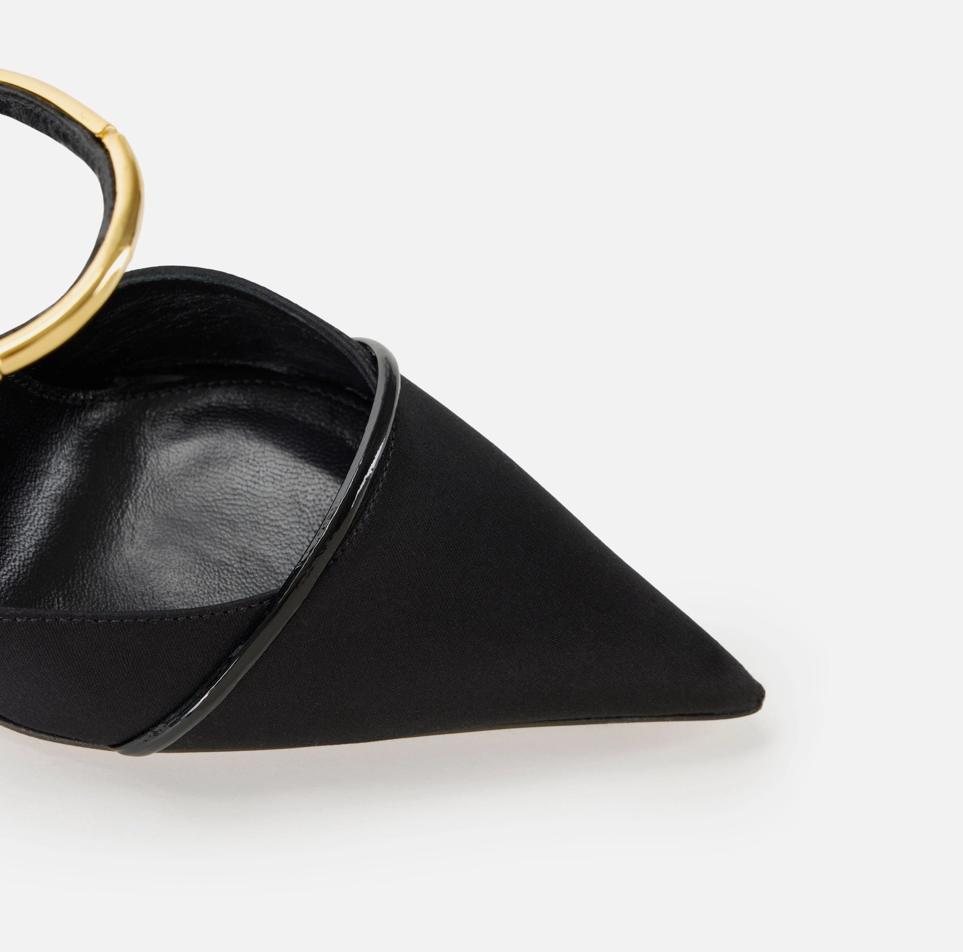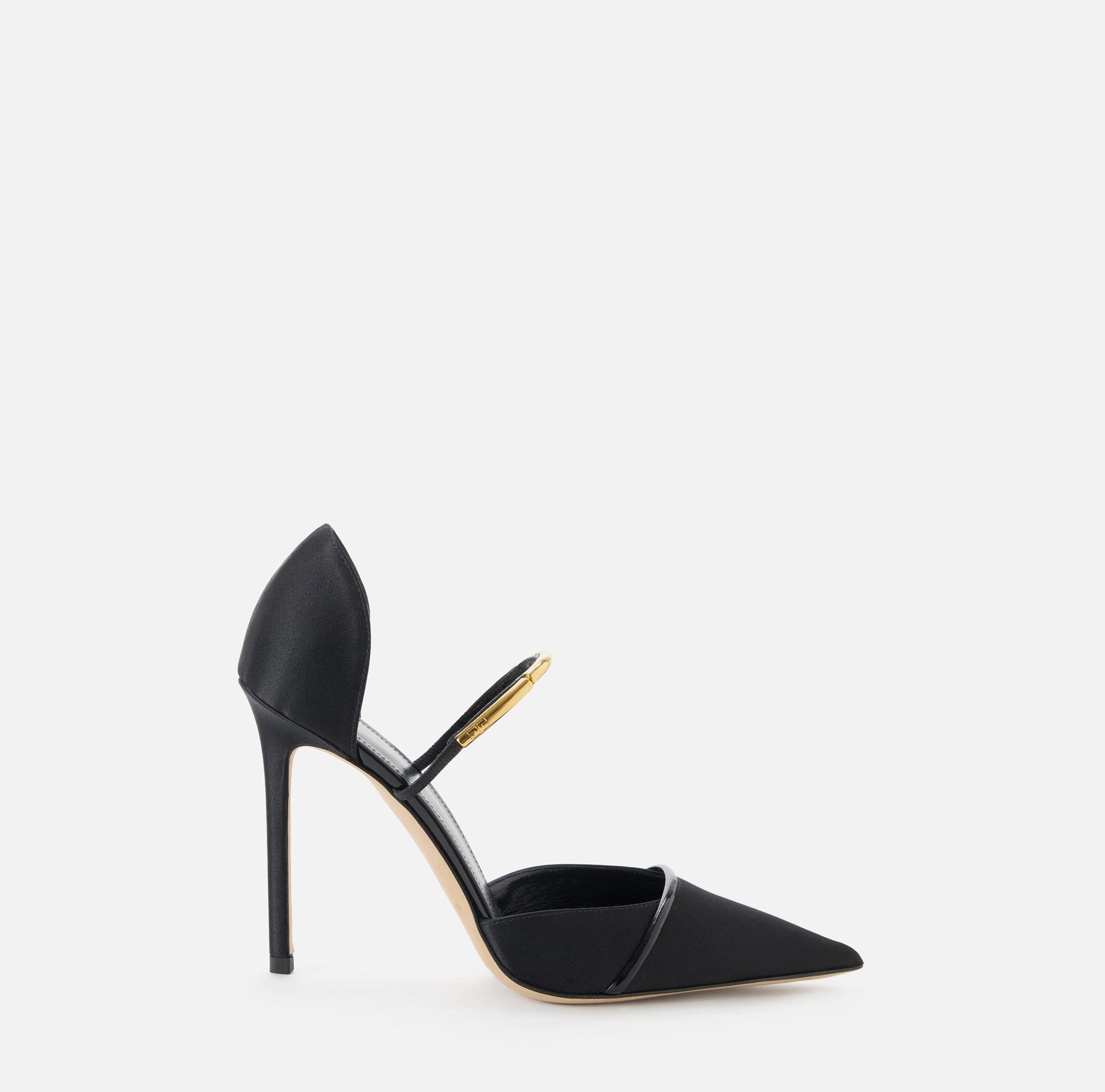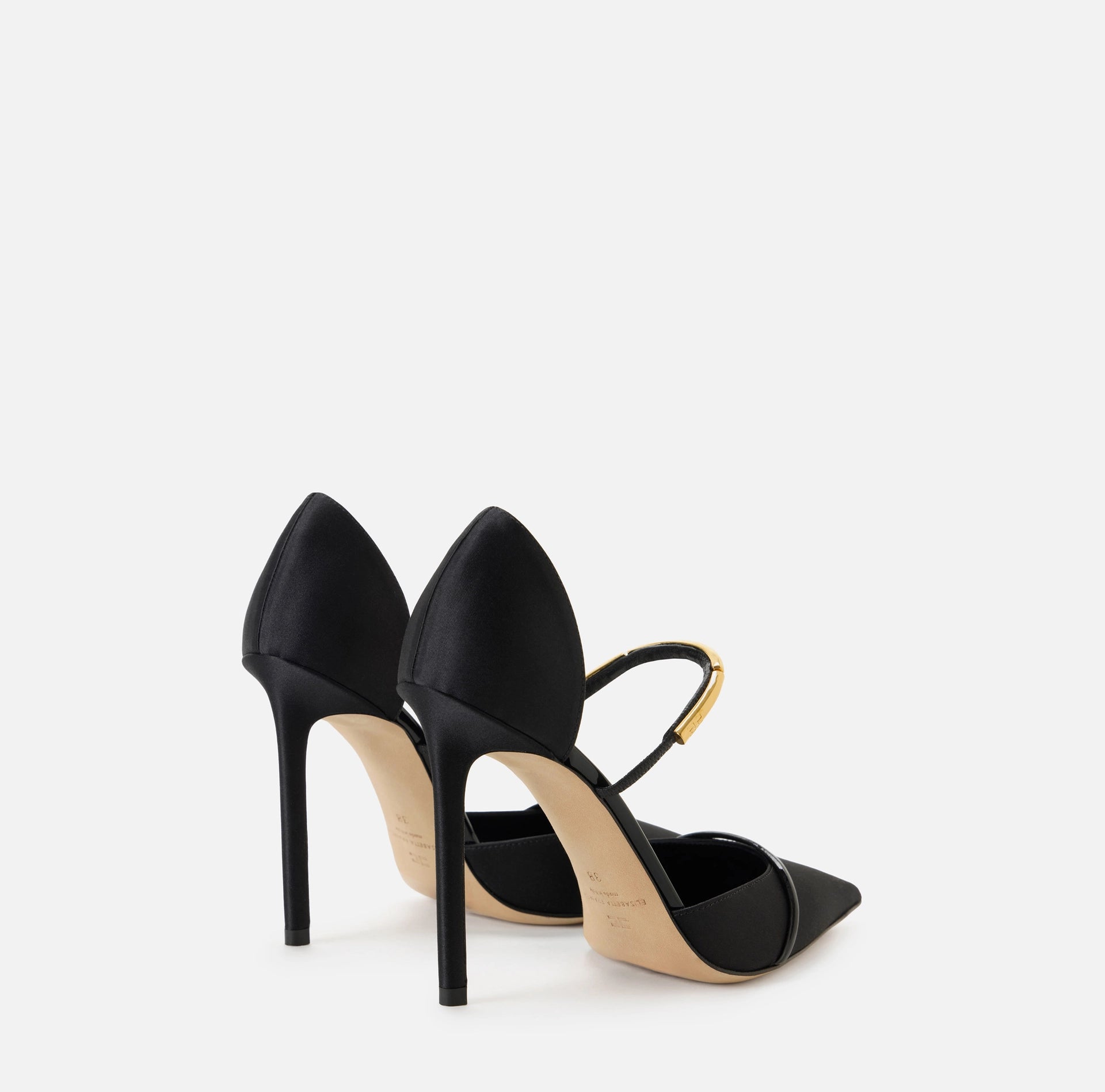 D'Orsay realizzate in raso con punta affusolata e tacco stiletto. Si distinguono per il dettaglio a mezza luna in metallo dorato con logo laterale.