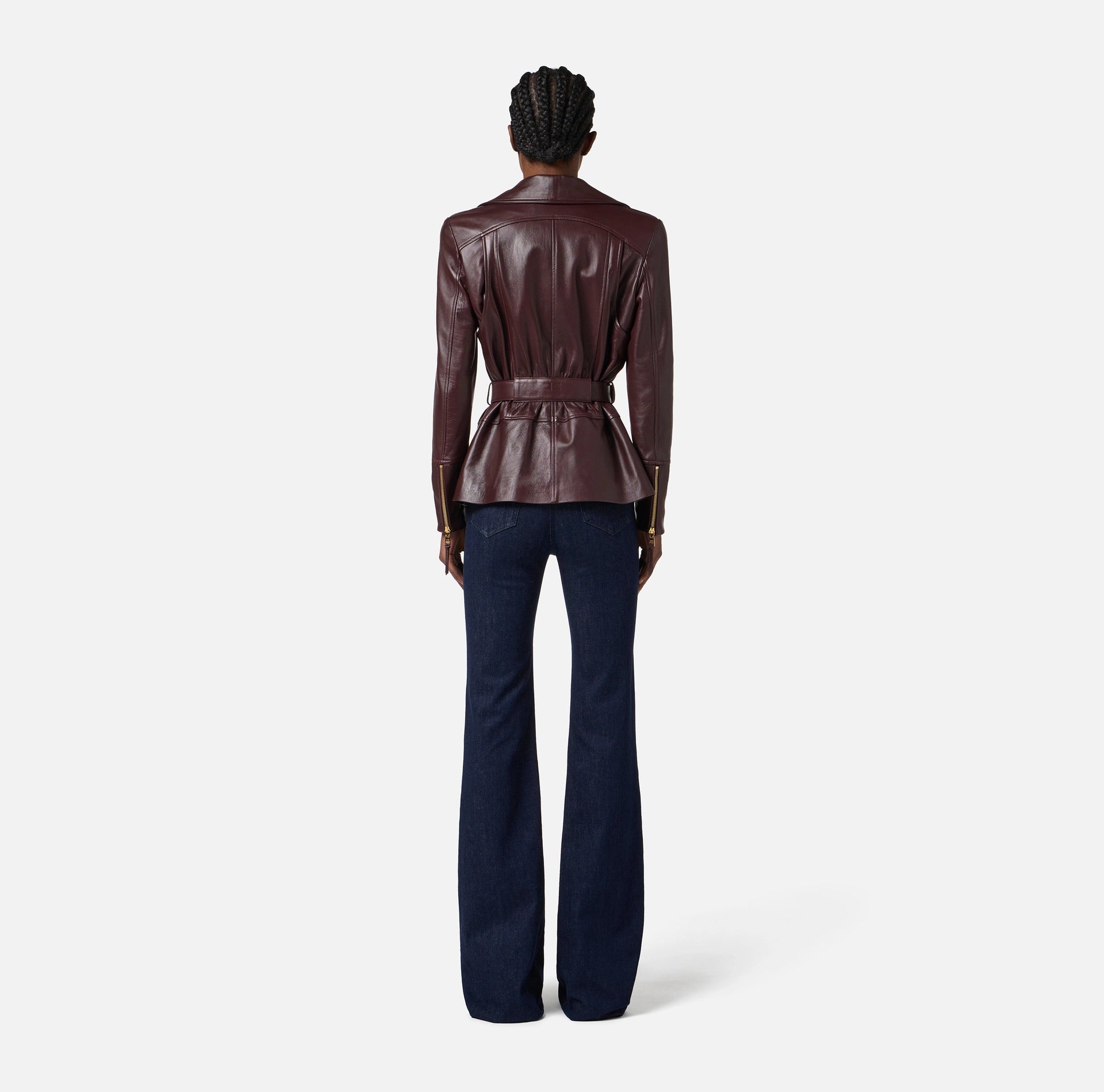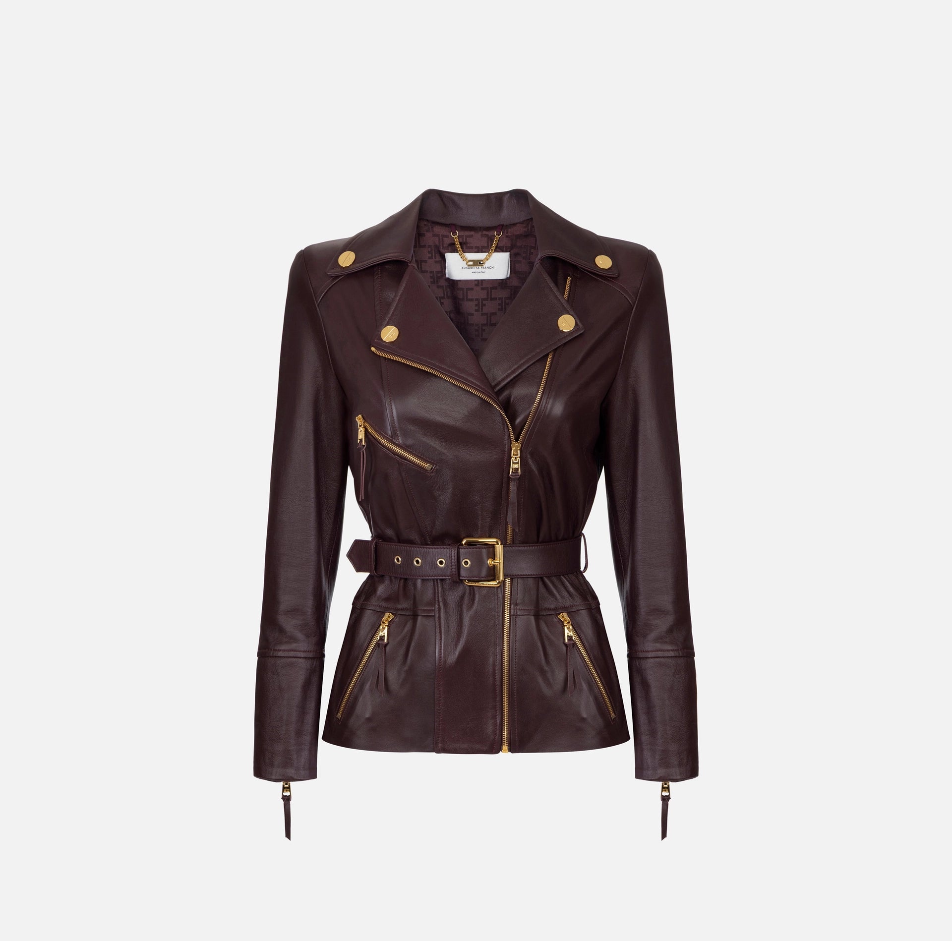 Chiodo in pelle. La giacca richiama i classici modelli biker con rever, tasche e chiusura asimmetrica con zip. Reinterpretata per l'eleganza contemporanea con spalle strutturate, cintura con fibbia che esalta il punto vita e passante con logo sul retro a creare un effetto di arricciatura.