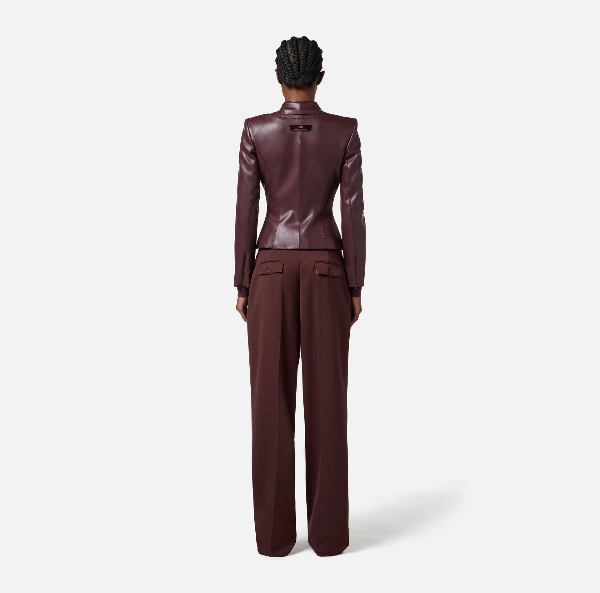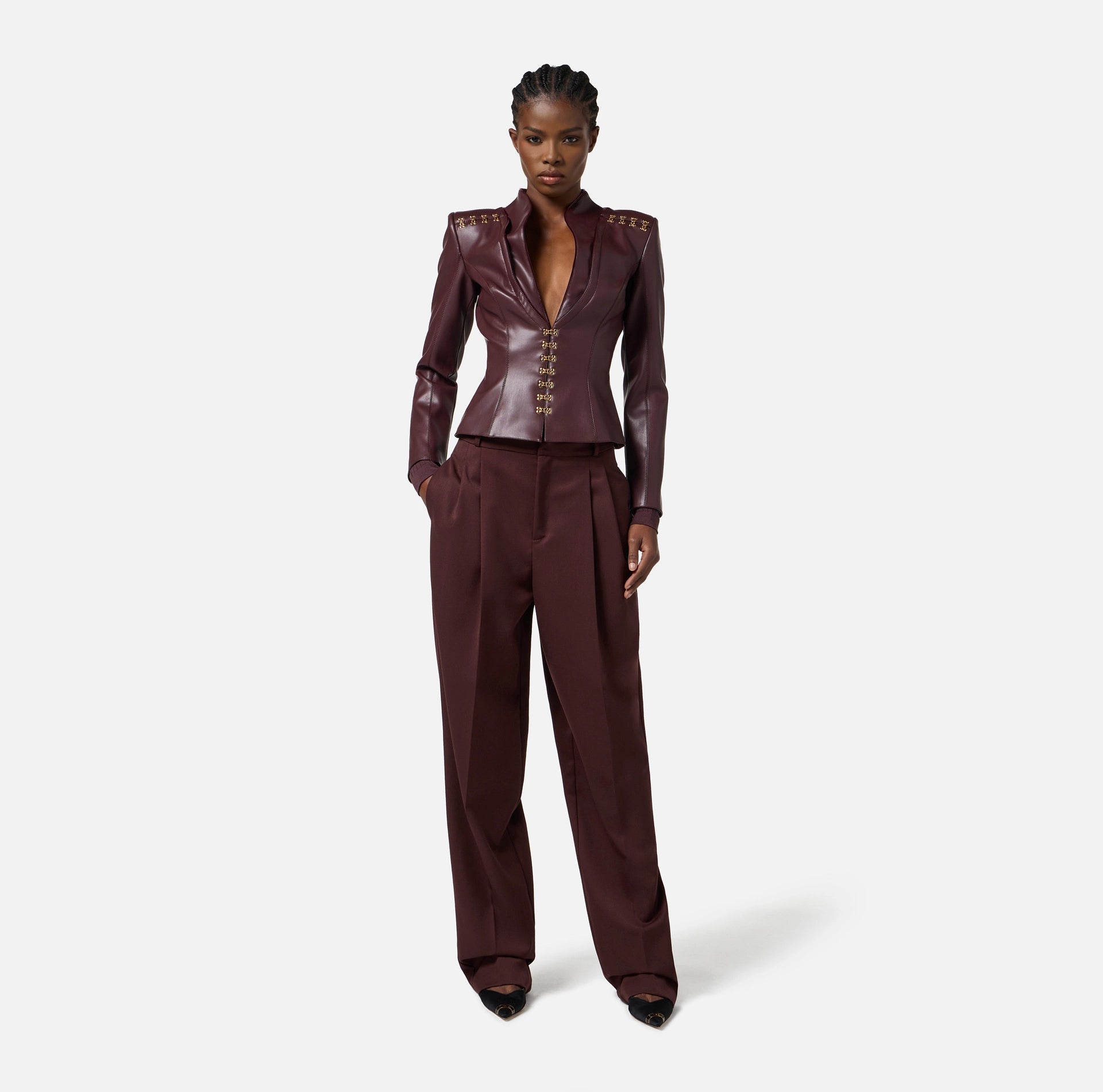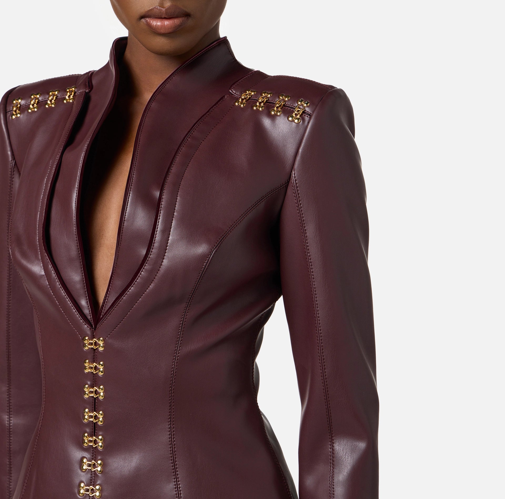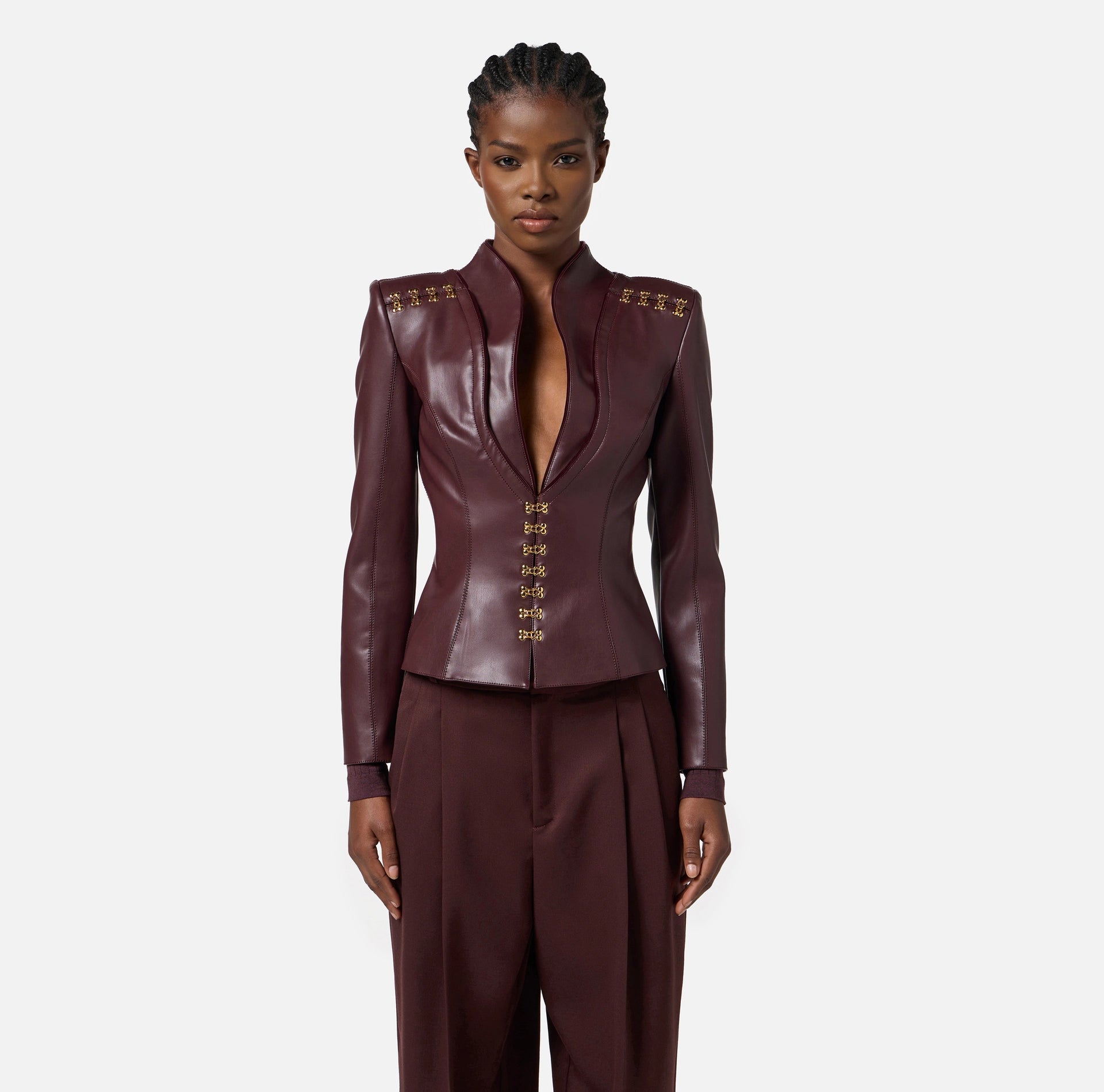 Giacca realizzata in materiale sintetico effetto nappa. Ha spalle strutturate e rever sagomato che crea particolari effetti di bordatura, esaltati da dettagli di piping e dalla costruzione a bustier che scolpisce la silhouette. I ganci in metallo dorato illuminano spalle e busto. Vestibilità slim.