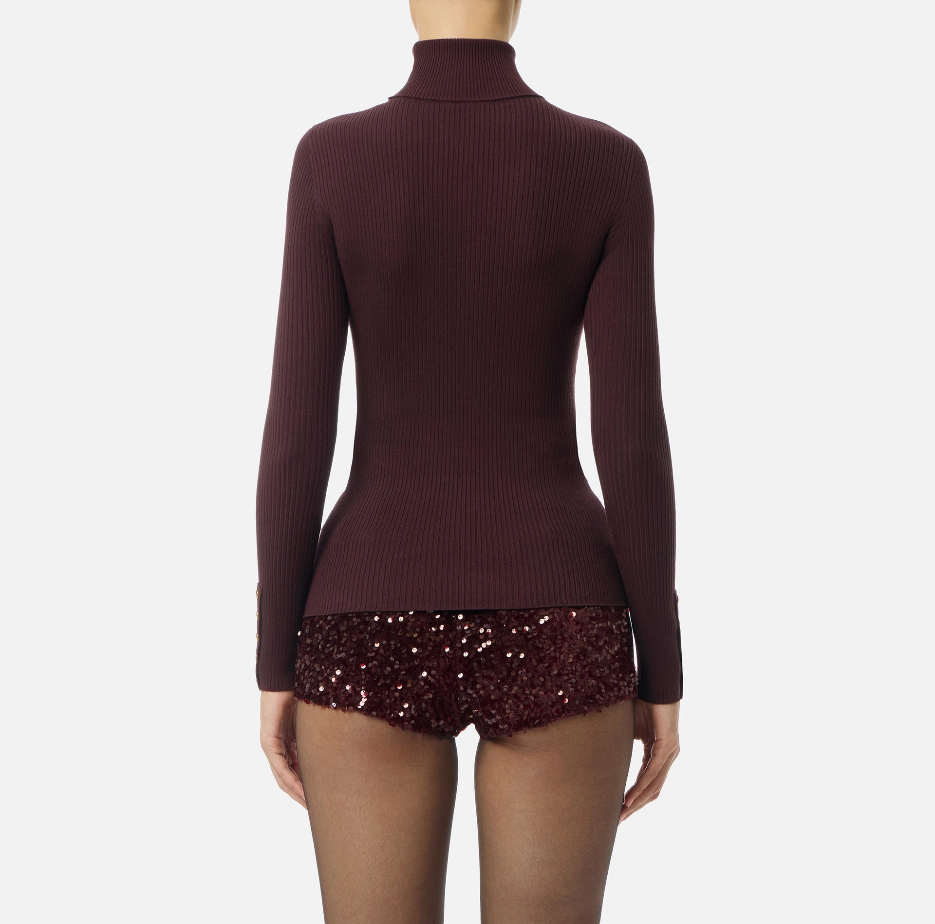 Maglia a costine dalla vestibilità aderente. Con collo dolcevita e maniche con bottoni al fondo, è personalizzata dal taschino in raso con dettaglio logo che regala una nota di luce.
