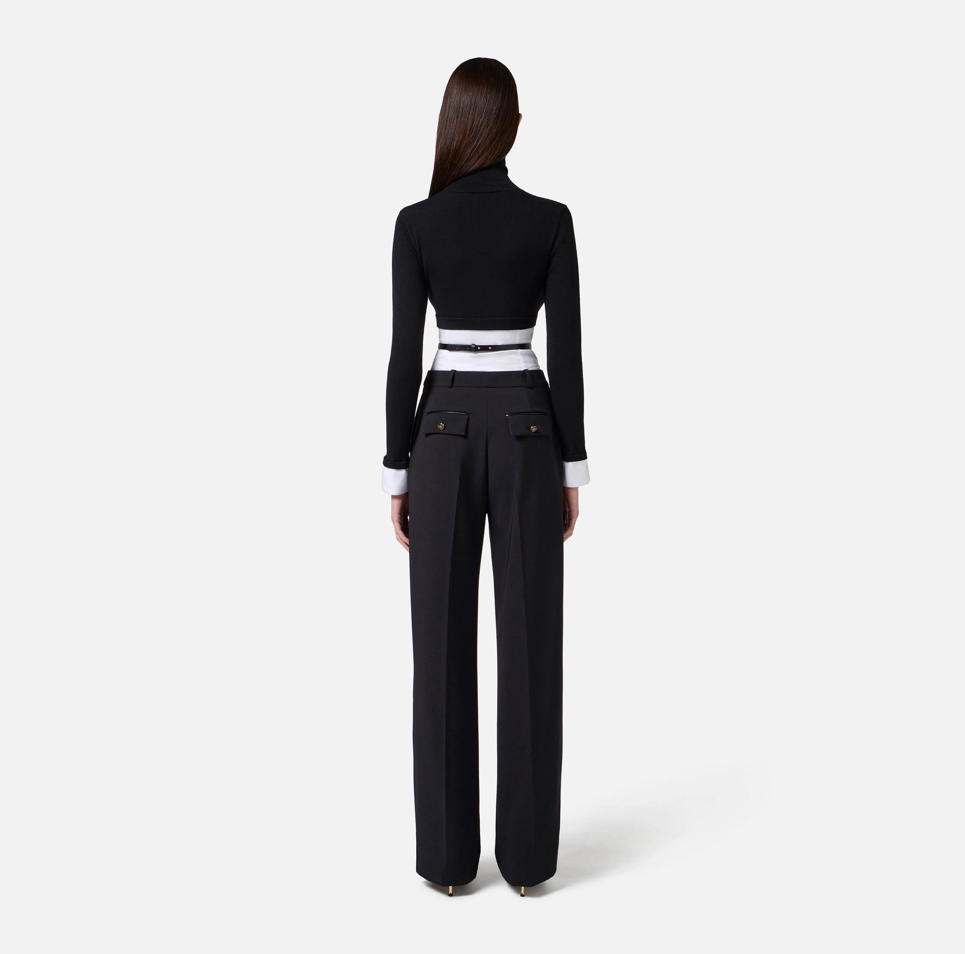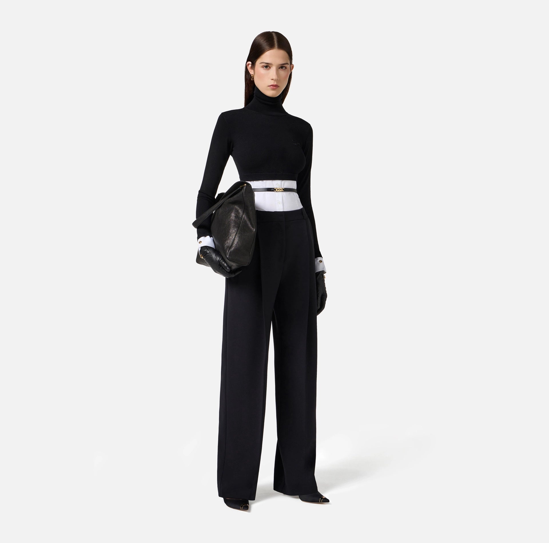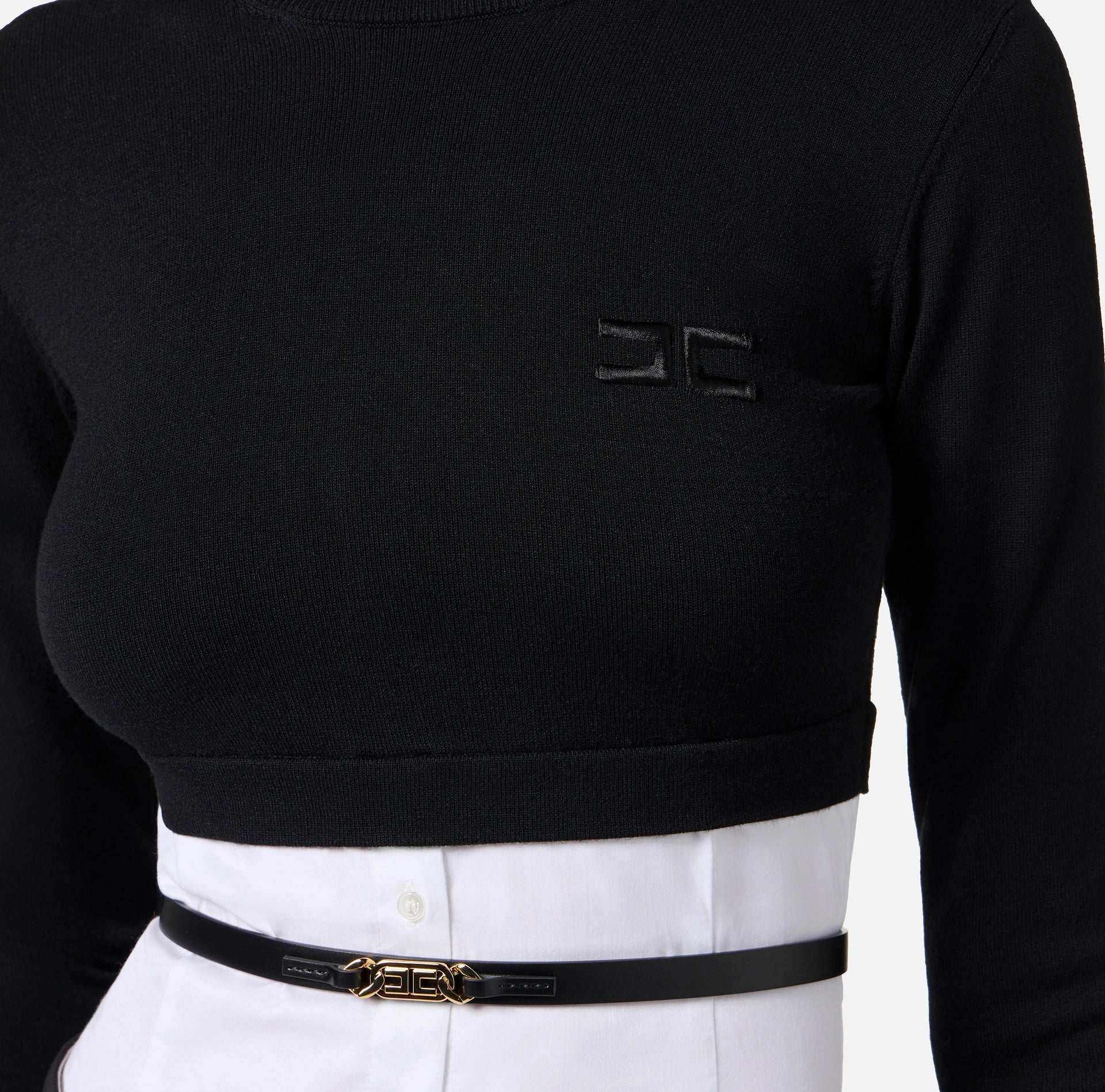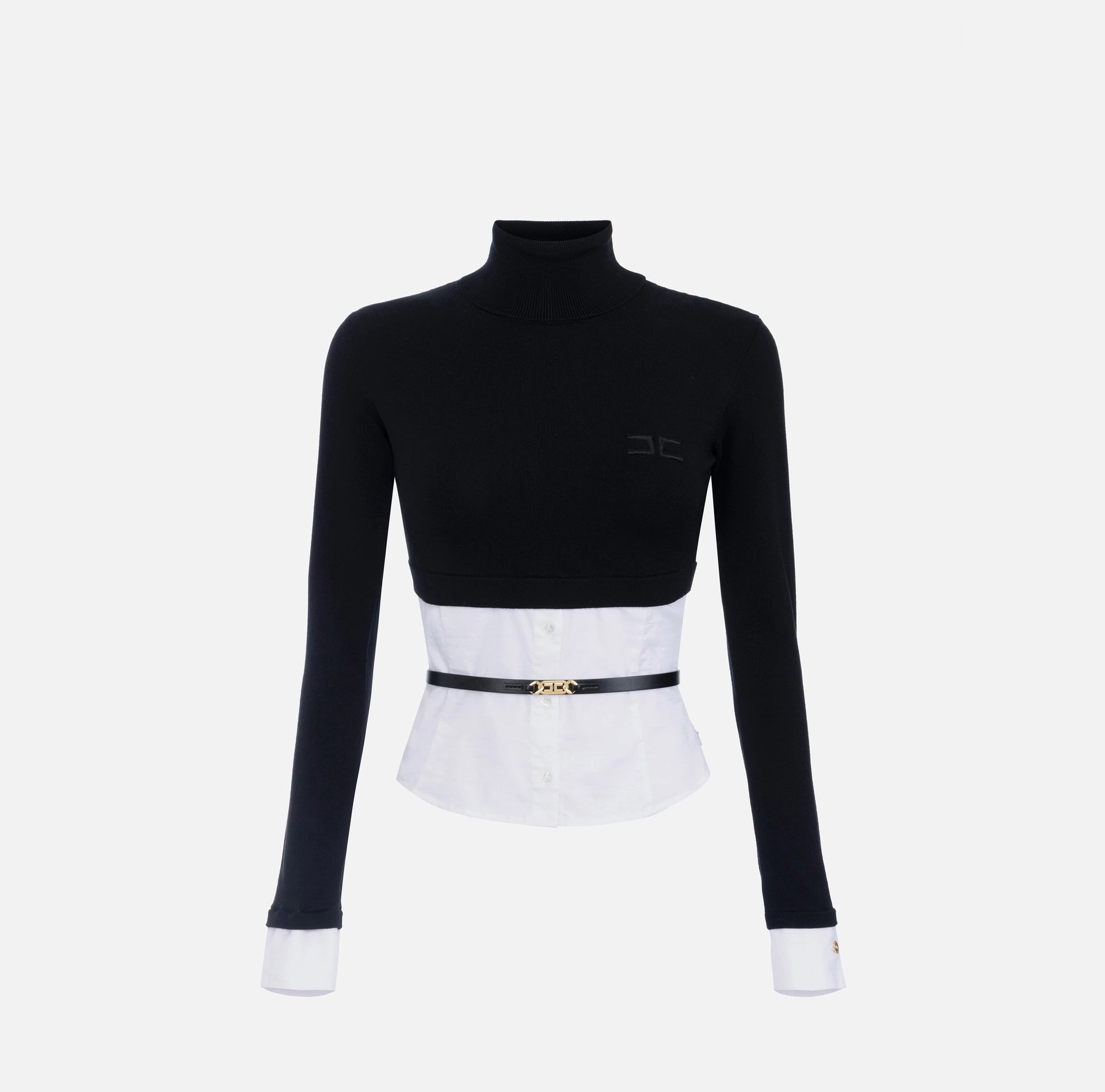 Maglia in viscosa con fondo in popeline di cotone a ricreare l'effetto di una camicia. Con collo dolcevita e maniche lunghe con polsini, ha logo ricamato su un lato. La cintura con logo dona uno studiato contrasto. Vestibilità aderente.