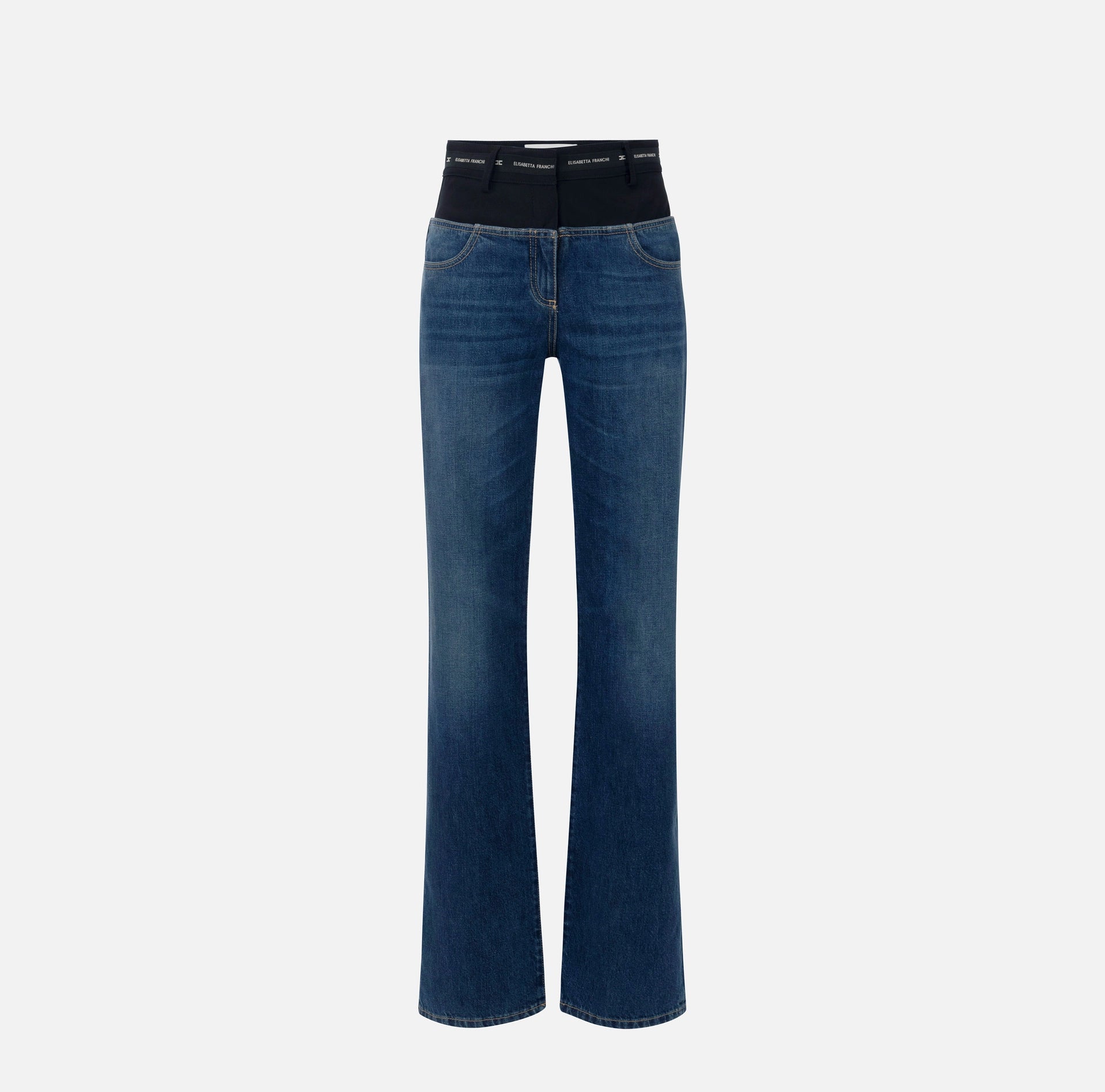 Pantaloni in denim a palazzo con vita bassa e dalla vestibilità regular. Si distinguono per il fascione realizzato in crêpe leggero, personalizzato da dettagli di piping con logo a contrasto.