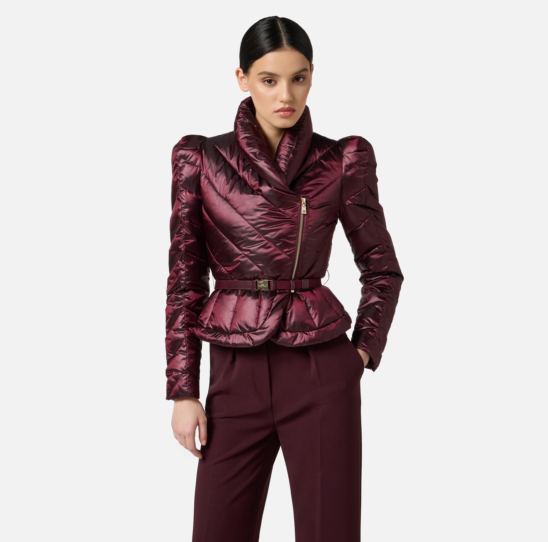 Piumino corto in tessuto vela dalla luminosa texture cangiante. Imbottito e trapuntato con motivi chevron, si distingue per il collo alto sovrapposto e per le maniche con spalle bombate dai leggeri motivi di arricciatura. La baschina definita dalla cintura con fibbia esalta la linea femminile del capo. Vestibilità slim.
