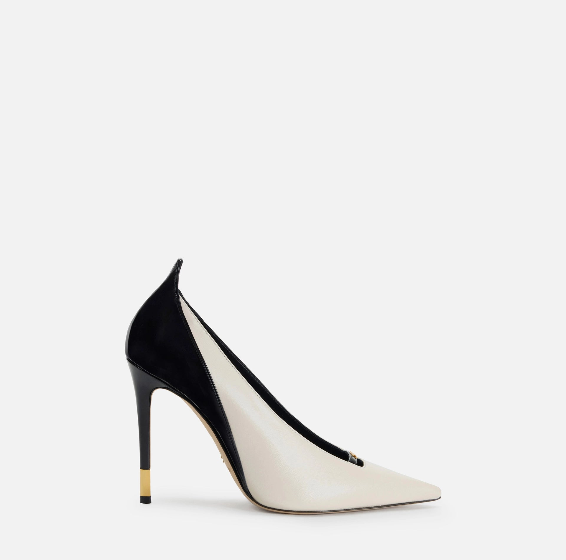 Pump in pelle con punta affusolata e tacco stiletto. Si distinguono per la colorazione bi-color e i dettagli in finitura dorata come il logo sul davanti e parte del tacco.